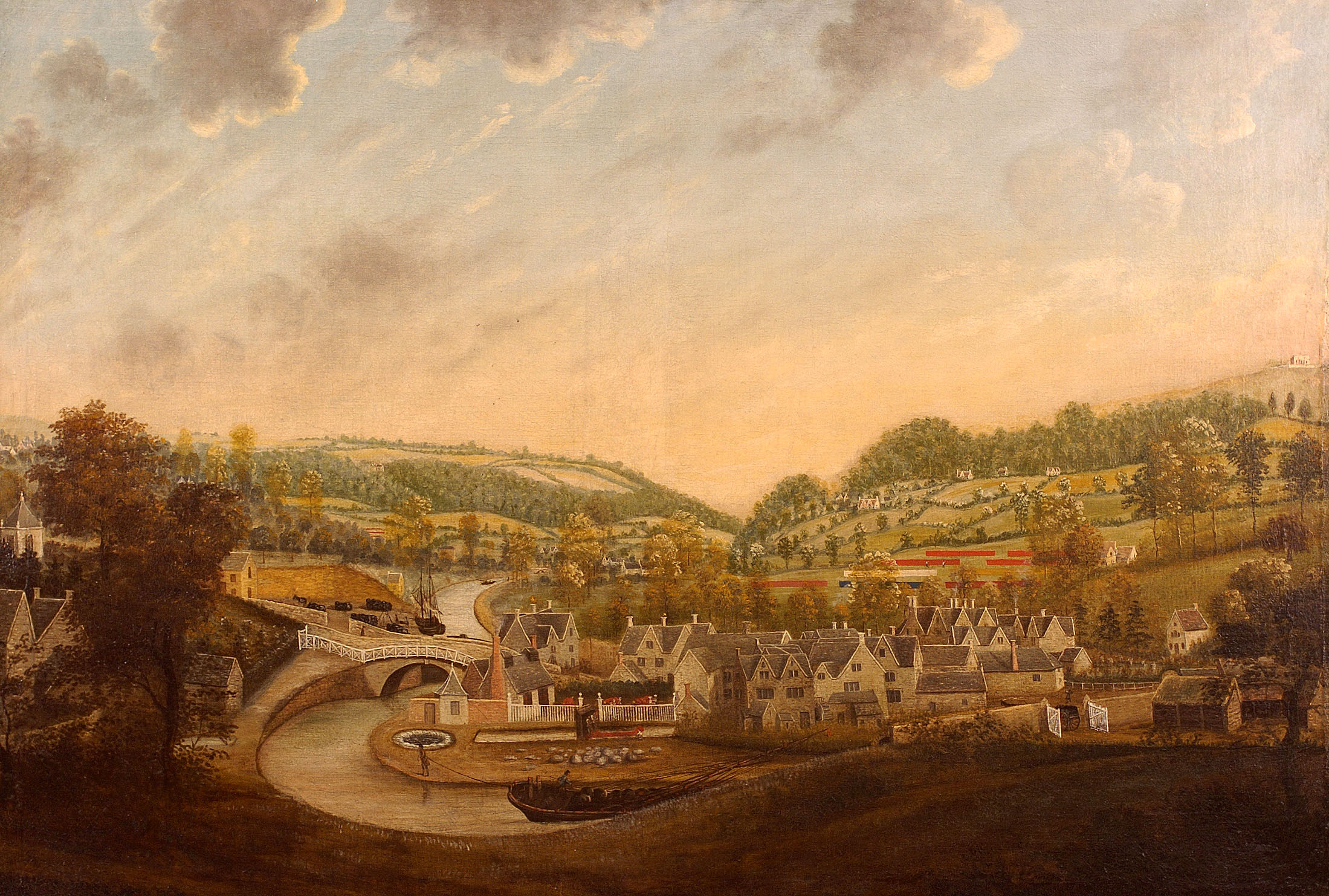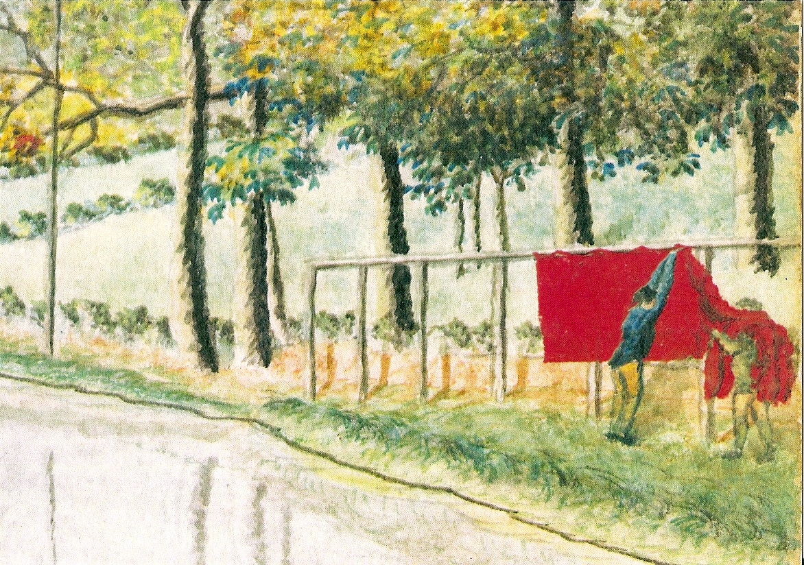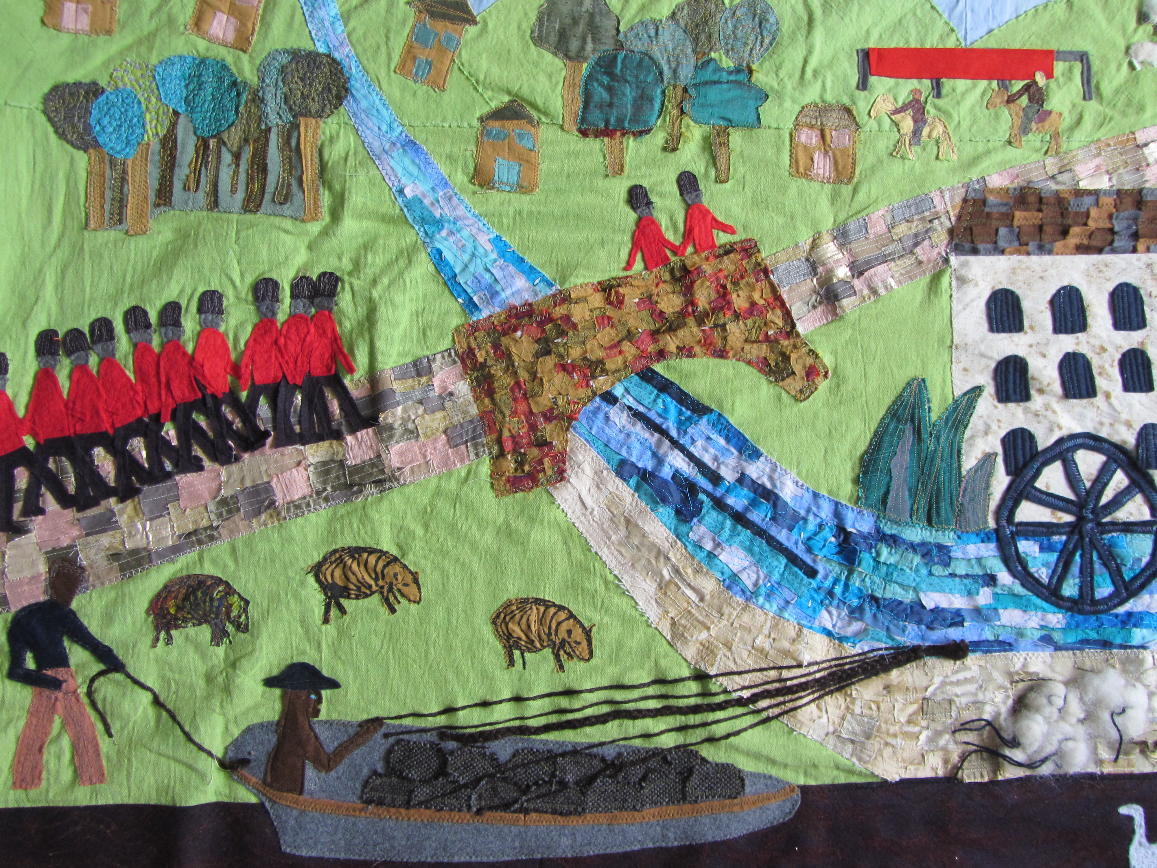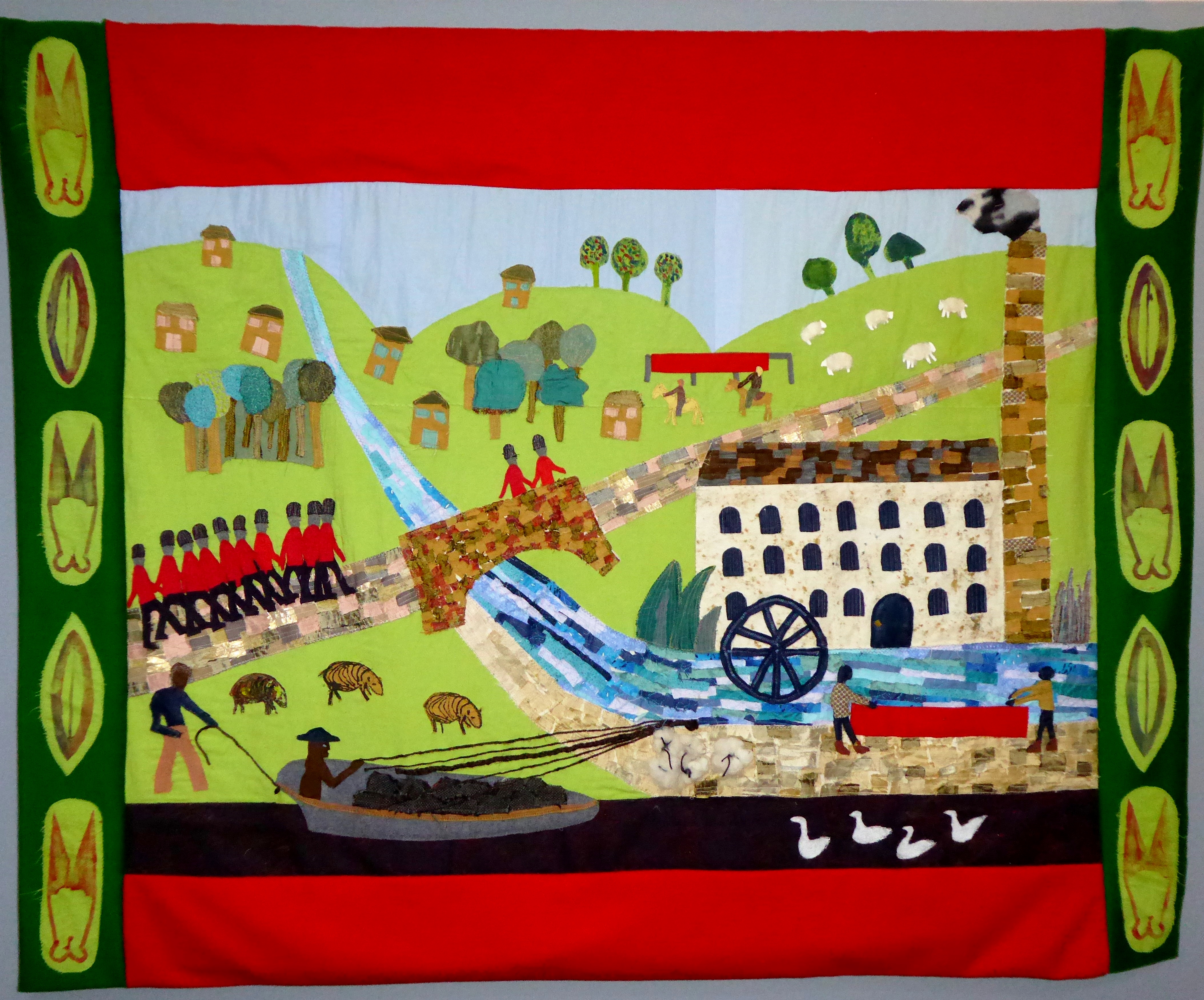 Textile wall hanging at Scarlet House Care Home on theme of the Stroud Scarlet – the bright red cloth which was made for centuries in the mills around Stroud and which clothed the British army. The design was influenced by 18th century paintings in Stroud Museum.